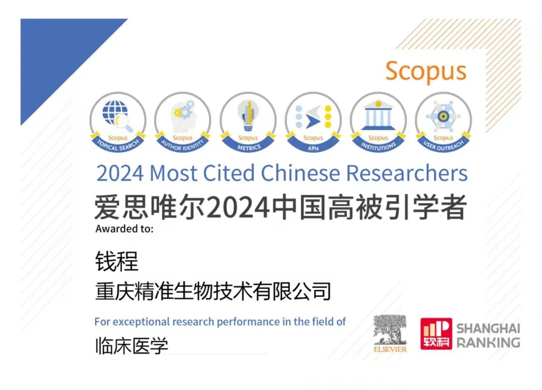 On March 25th, the 2024 Elsevier Highly Cited Chinese Researchers list was announced.A total of 6,388 scholars were on the list, including 329 scholars in the discipline of clinical medicine. Prof. Cheng Qian, Chairman and Chief Scientist of Chongqing Precision Biotech, has been on the list for 4 consecutive years due to his outstanding academic influence as a unique academic leader in the field of clinical medicine.